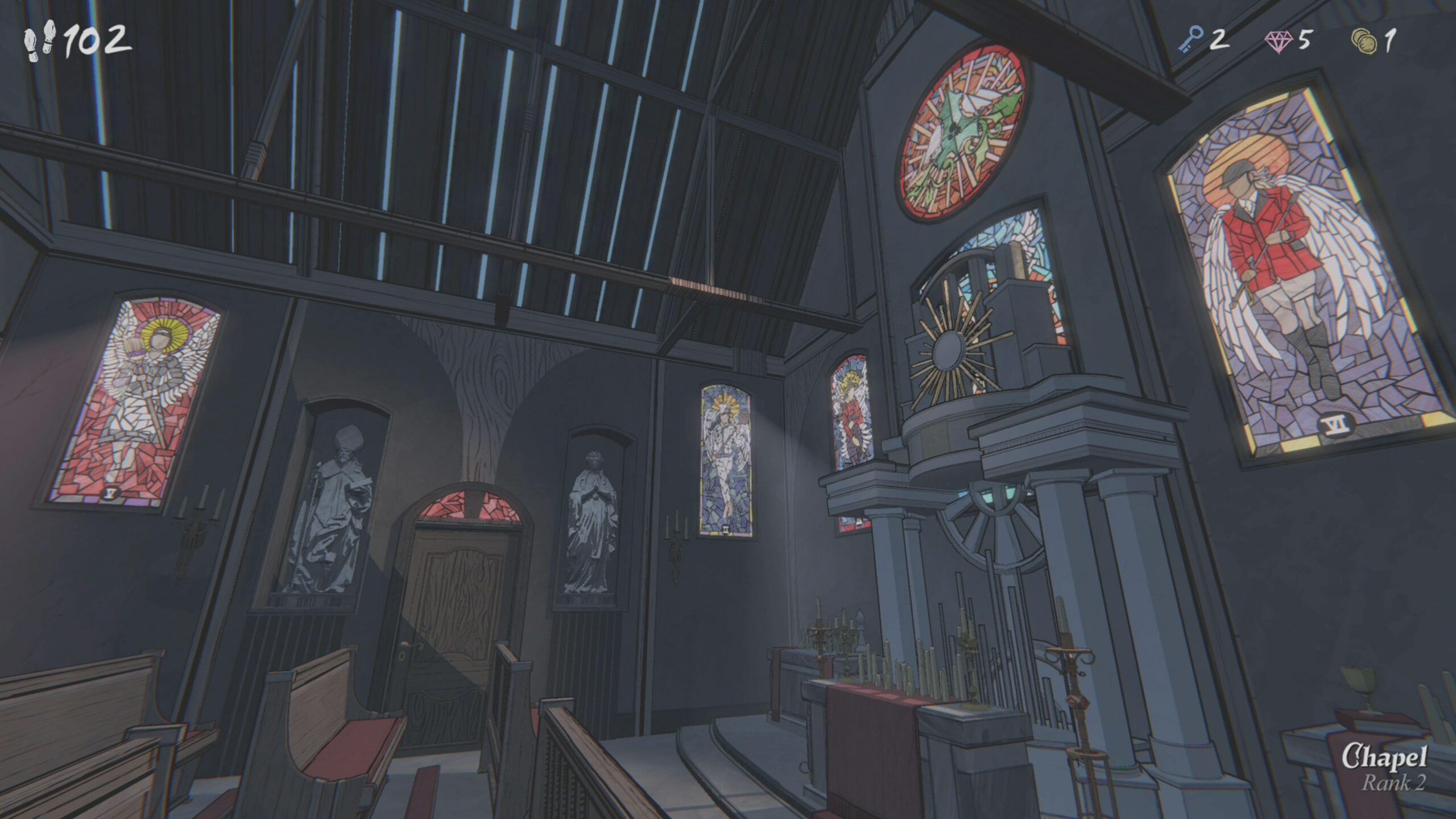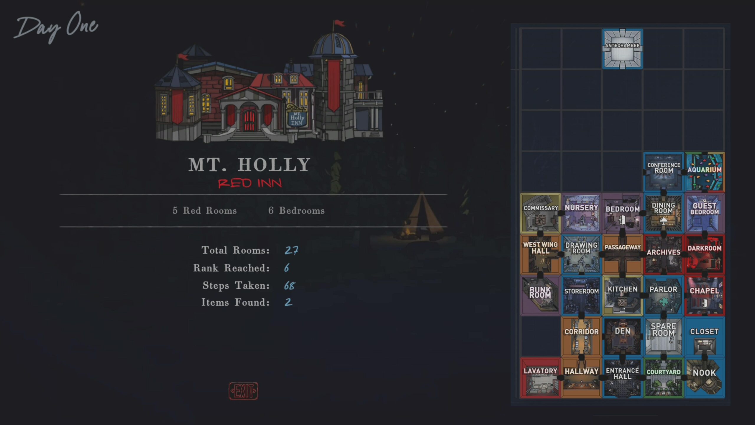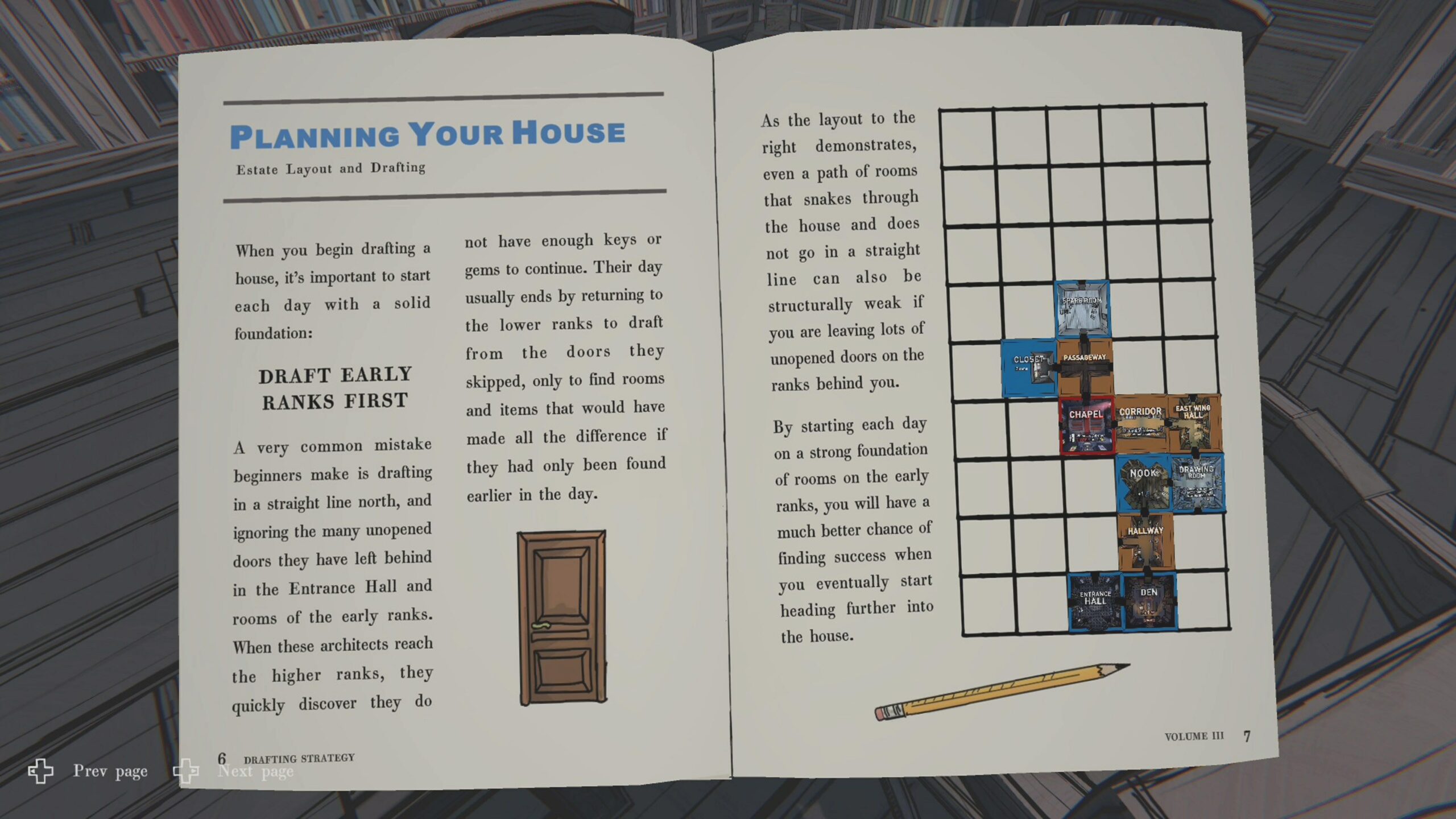 Mt. Holly besteht aus einem Raster von 45 Räumen, fünf in der Breite und neun in der Länge, das sich bei jedem Tag neu zusammensetzt. Jeden Morgen müssen wir also von vorn beginnen, in typischer Rogue-like-Manier. Unser Ziel bleibt gleich und wirkt fast widersprüchlich: Wir wollen Raum 46 erreichen, der im Grundriss nicht einmal vorgesehen ist. Hinweise darauf liegen verstreut im Haus, versteckt in Texten, Symbolen und Gegenständen. Erzählerische Elemente bleiben dabei bewusst im Hintergrund und treten eher als Fragmente auf. Statt einer klassischen Geschichte finden wir ein Netz aus Andeutungen, das sich uns nur langsam erschließt. Es ist aber eng mit unseren Entscheidungen im Grundriss und vielen Rätsellösungen verknüpft.