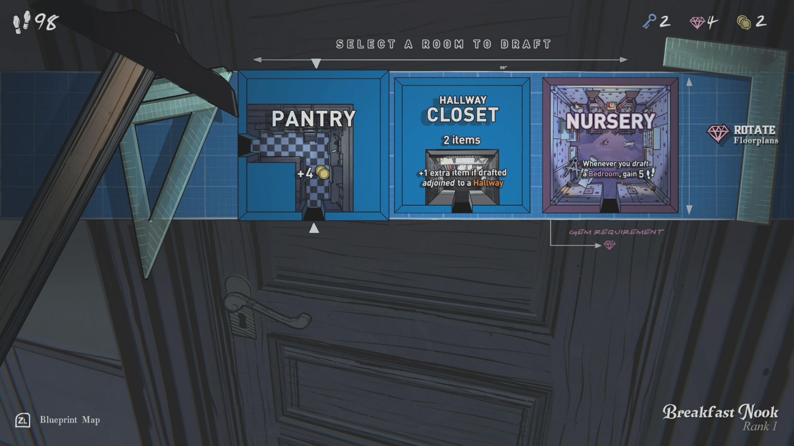 An jeder Tür entscheiden wir, welcher Raum dahinter liegt. Drei zufällige Optionen geben eine Richtung vor, aber keine Sicherheit. Alle Räume unterscheiden sich nicht nur optisch, sondern vor allem funktional. Manche öffnen Wege in die eine oder andere Richtung, andere enden in einer Sackgasse. Schlüssel, Edelsteine, Münzen und Spezialgegenstände bestimmen, welche Räume wir überhaupt sinnvoll nutzen können. Ressourcen sind deshalb kein Bonus, sondern eine wichtige Voraussetzung. Ein schlecht platzierter Raum kann Verbindungen blockieren und Wege dauerhaft abschneiden. Was zunächst wie eine freie Gestaltung wirkt, entpuppt sich schnell als enges Geflecht aus Abhängigkeiten und schränkt uns in der Auswahl mitunter ein.
