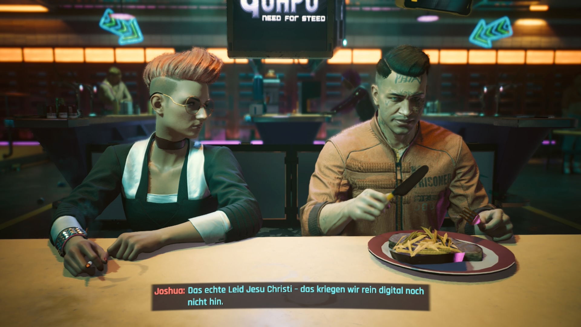 Night City ist der eigentliche Star von Cyberpunk 2077. Die Stadt der Zukunft präsentiert sich als gewaltige, neongetränkte Metropole voller Gegensätze: Glitzernde Wolkenkratzer erheben sich über Elendsvierteln, Hightech-Laboratorien grenzen an Gassen voller Müll und provisorischer Behausungen. Überall in dieser offenen Welt tummeln sich Einwohnerinnen und Einwohner mit eigenen Zielen. Die meisten davon kämpfen schlicht ums tägliche Überleben. Night City ist keine bloße Kulisse, sondern ein Charakter für sich, der uns immer wieder daran erinnert, wie klein wir in diesem Moloch eigentlich sind. Gleichzeitig spiegelt die Welt eine beeindruckende Diversität wider: Von schlanken Street-Punks über korpulente Barbesitzerinnen bis zu Menschen mit umfangreichen Cybermodifikationen treffen wir auf alle nur erdenklichen Körpertypen. Unterschiedliche Kulturen, Sexualitäten und Lebensentwürfe koexistieren in diesem Schmelztiegel der Zukunft, was für ein angenehm inklusives Gefühl sorgt.