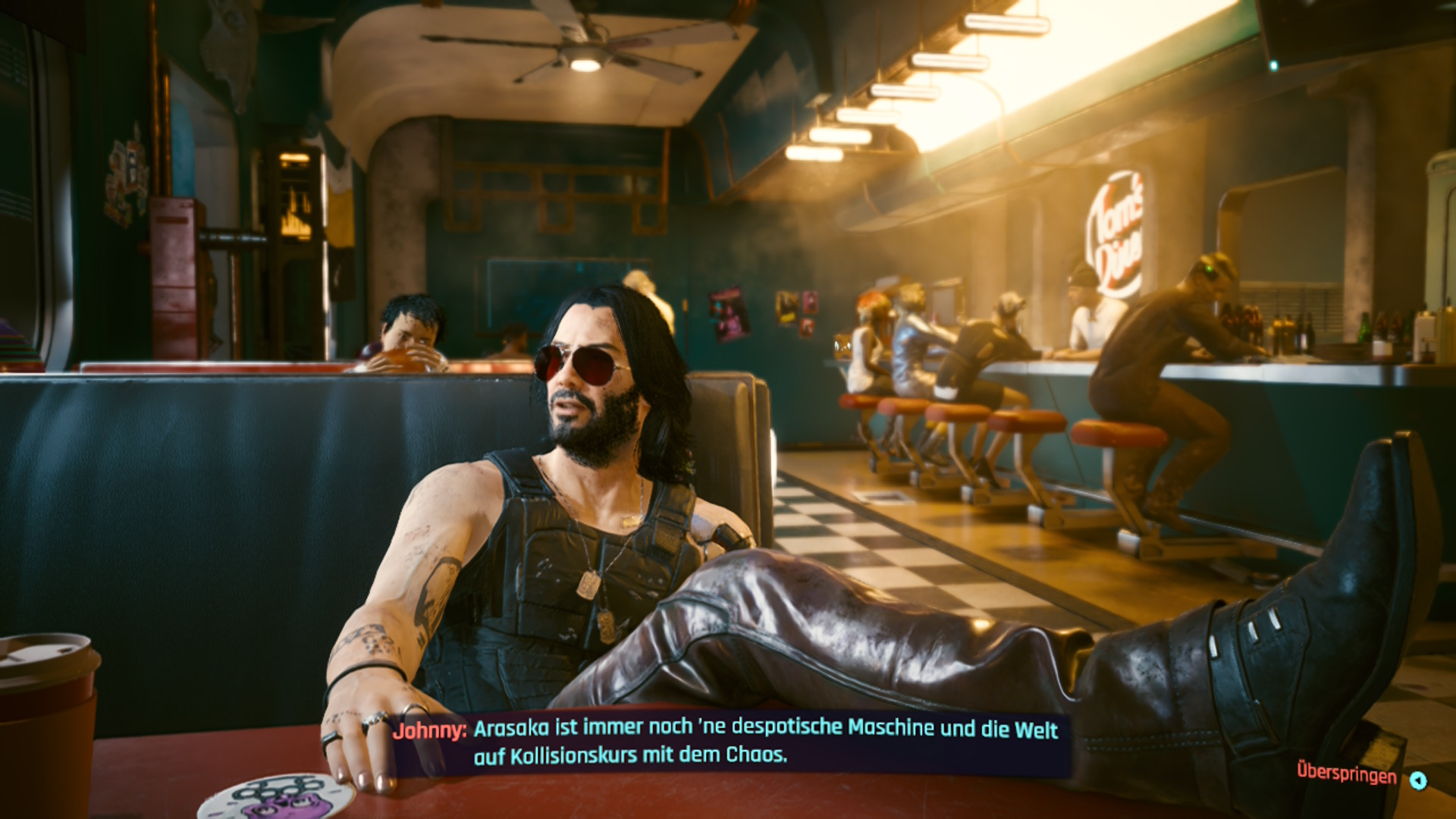 Ebenso bemerkenswert ist die Atmosphäre von Night City: Die Metropole ist keine seelenlose Kulisse, sondern scheint auch ohne uns zu existieren. Auf Schritt und Tritt spüren wir, dass Night City als gigantischer Moloch von Konzernen wie Arasaka beherrscht wird und unsere Existenz dem System im Grunde egal ist. Dieser nihilistische Ansatz macht trotzdem Spaß, denn wir können in den Nebenmissionen und Dialogen unseren eigenen Sinn finden und Spuren hinterlassen. Die Hauptgeschichte zieht das Tempo deutlich an. Im Prolog lernen wir unseren Kumpel Jackie kennenlernen und wenig später die digitale Legende Johnny Silverhand. Plötzlich hängt Vs Leben an einem gestohlenen Biochip-Prototyp. Wir haben dadurch im Kampf gegen die Zeit und die Machenschaften der Konzerne wahrlich Größeres zu tun, als uns um die Belanglosigkeit unseres Daseins zu scheren.