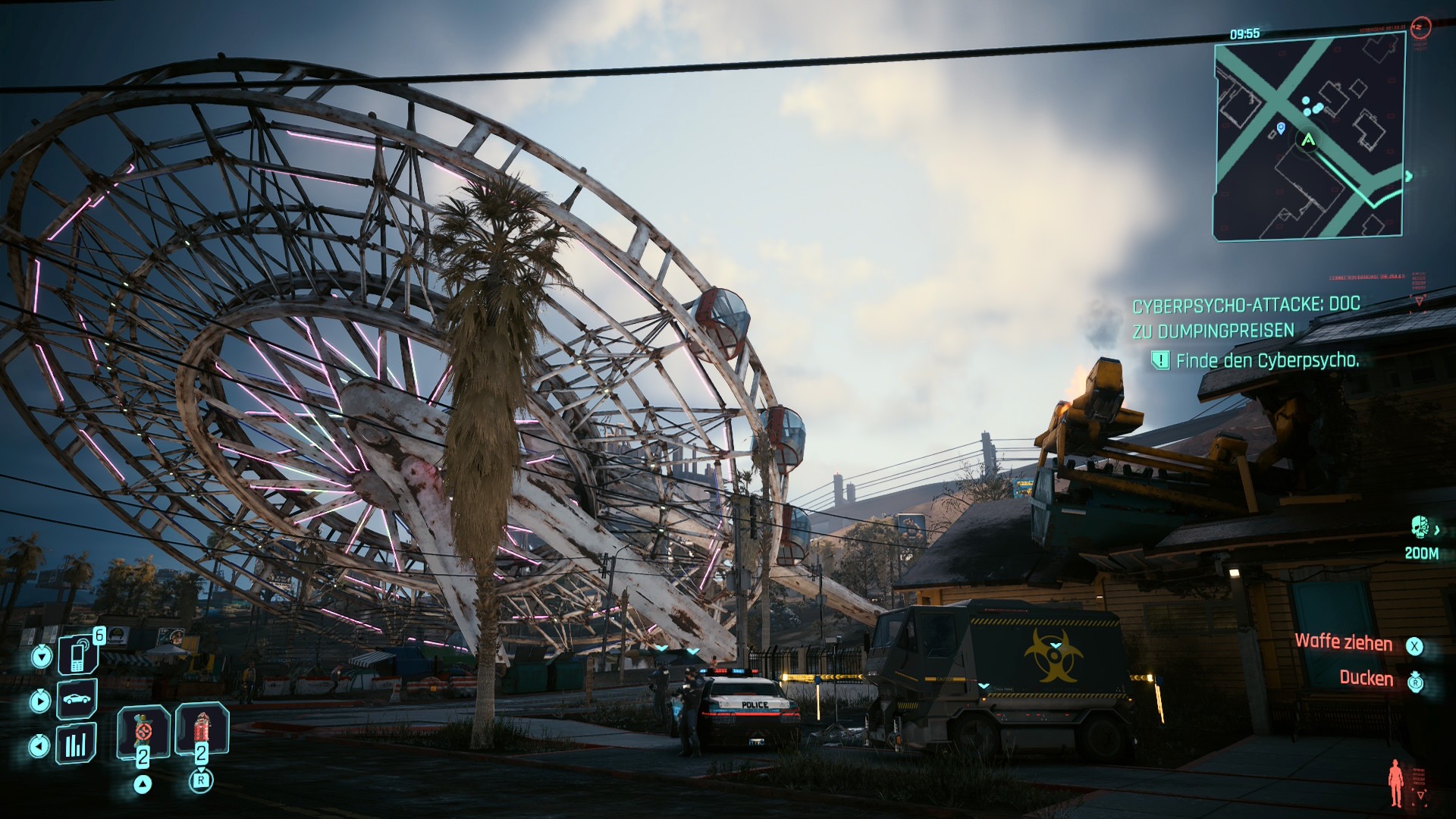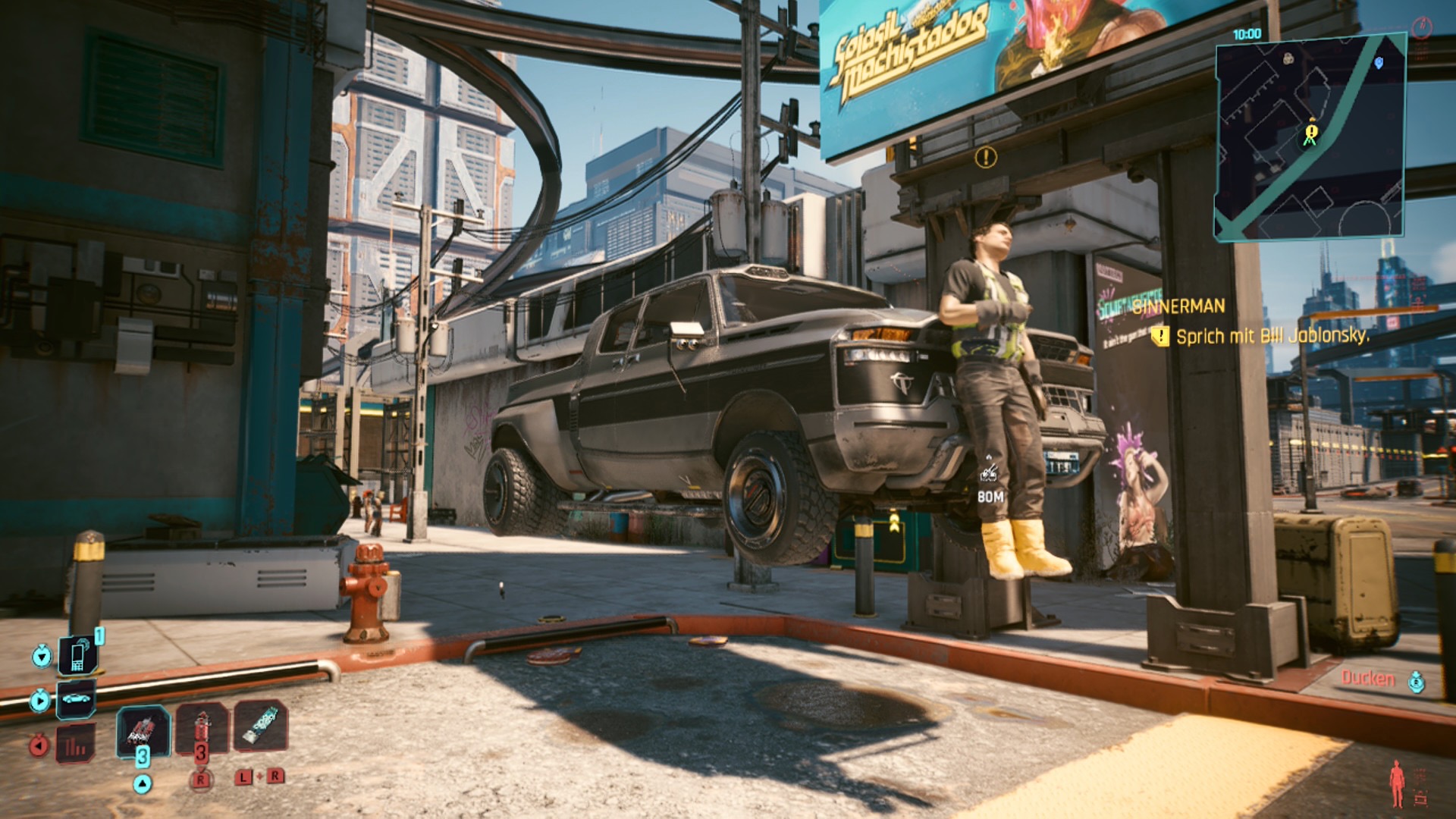 Auch sonst wurde die Umsetzung sorgfältig optimiert. Die Ladezeiten sind kurz – ein paar Sekunden Schwarzbild nach dem Laden eines Spielstands, dann stehen wir auch schon wieder mitten in Night City. Im regulären Spielverlauf sind Ladebildschirme selten, da die Welt nahtlos erkundet wird und selbst schnelle Fast-Travel-Reisen zügig geladen werden. Die Steuerung haben die Entwickler vorbildlich an die Möglichkeiten der Switch 2 angepasst: Neben der klassischen Gamepad-Steuerung mit den Joy-Con 2 gibt es optionale Bewegungssteuerung für präziseres Zielen und sogar Touchscreen-Unterstützung in den Menüs. Auch integriert ist die Möglichkeit, den rechten Joy-Con wie eine Infrarot-Maus zu verwenden – damit lässt sich der Cursor genau bewegen, was beim Hacken oder beim Zielen mit Scharfschützengewehren hilft. Allerdings funktioniert das nur über die Einstellung im Menü, nicht durch die Joy-Con-2-auf-den-Tisch-leg-Geste. Diese zusätzlichen Eingabemethoden funktionieren einwandfrei und zeigen, dass hier nicht einfach ein Eins-zu-eins-PC-Port abgeliefert, sondern an die Plattform gedacht wurde.
