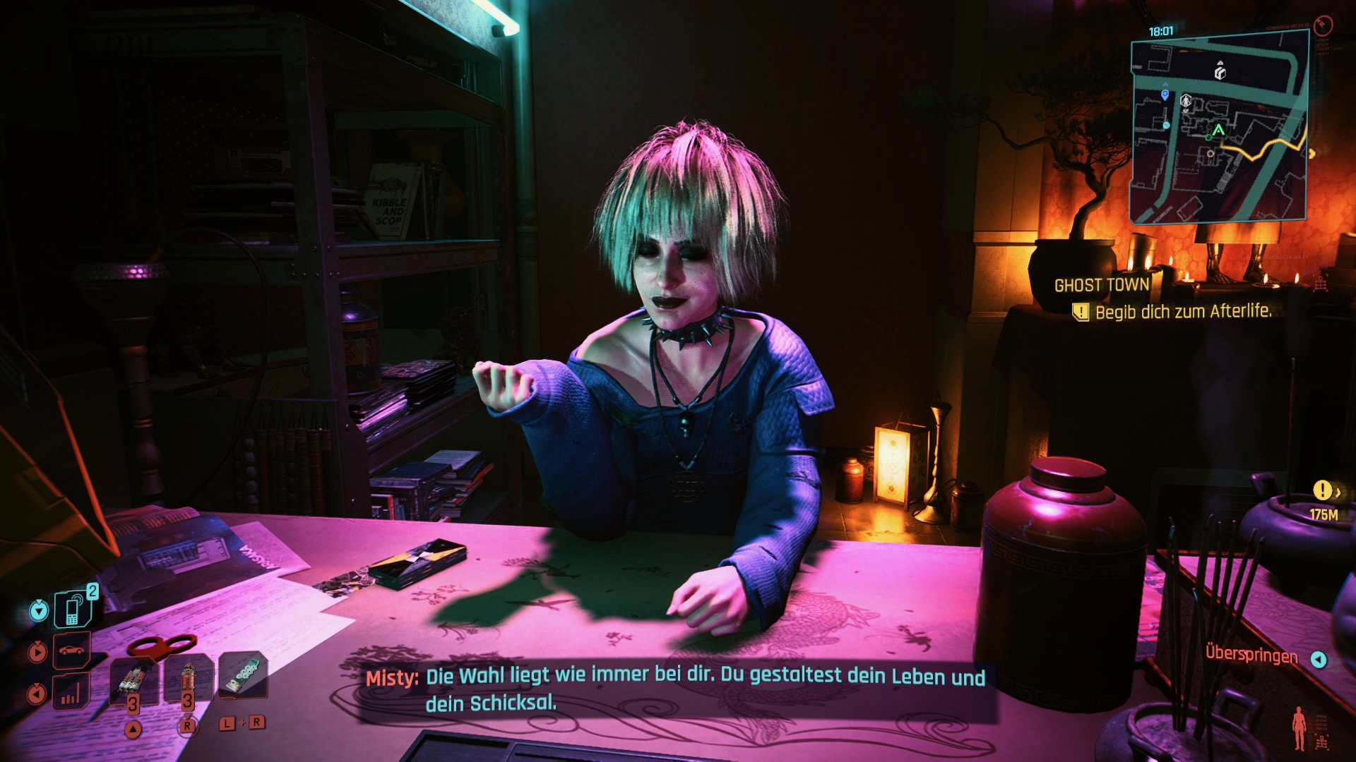 Die Missionen selbst sind ebenso variantenreich. Zwar läuft so mancher kleine Auftrag im Kern auf das Gleiche hinaus: „Gehe hinein, besorge X und verschwinde wieder“, doch wie wir das anstellen, bleibt uns überlassen. Ein und derselbe Gig kann je nach Herangehensweise völlig anders ablaufen, etwa indem wir uns per Cyberdeck in Kameras einklinken und Gegner ablenken, statt uns in einen direkten Kampf zu stürzen. Viele der größeren Quests sind darüber hinaus einzigartig inszeniert und behandeln Themen, die wir so in keinem anderen Spiel finden. Die packenden Hauptmissionen treiben nicht nur die Story rund um V und Johnny Silverhand voran, sondern konfrontieren uns auch mit schwierigen Entscheidungen: Häufig stehen wir vor einer Auswahl aus Übeln, bei der es keine gute Lösung gibt. Gerade dieses Dilemma macht das Abenteuer so spannend, denn unser Handeln hat spürbare Auswirkungen auf verschiedene Charaktere – und auf die möglichen Enden der Geschichte.
