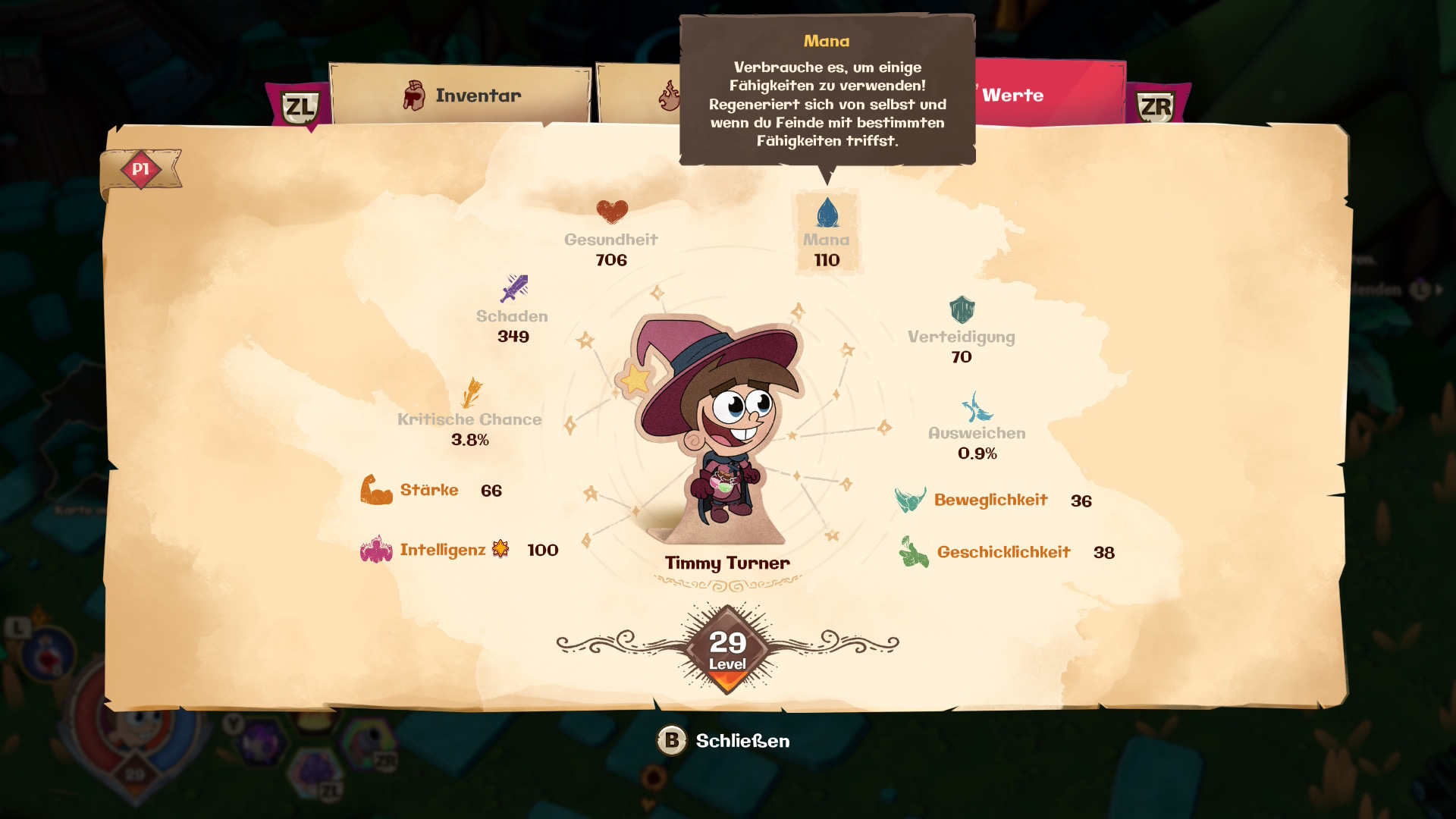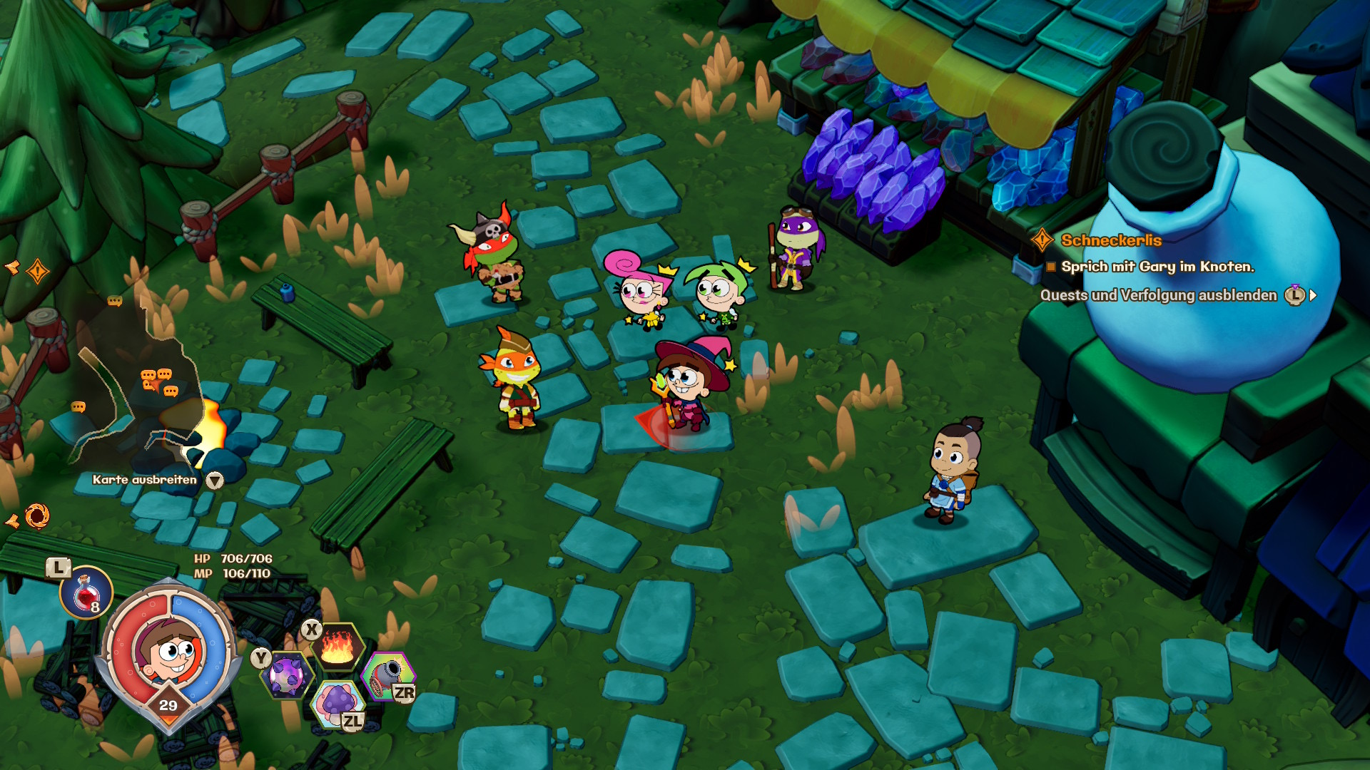 Ihr erlebt die Kampagne verteilt über 8 Welten, alle angelehnt an bestimmte Nickeloden-Serien, sowie dem Knoten, welcher als Hubwelt dient. Innerhalb des Knotens sammeln sich Stück für Stück Figuren wie Perla Krabs, die Turtles oder auch Karl Keucher von Jimmy Neutron, Karai und Zuko aus Avatar: Der Herr der Elemente und einige mehr. Sie fungieren vorrangig als Questgeber oder zum Aufleveln eures Inventars. Standardmäßig spielt Ihr erst einmal mit Timmy Turner, könnt allerdings direkt zu Beginn auch zwischen Spongebob, Leonardo, Katara und Sandy wählen. Dabei hat jede spielbare Figur Ihre eigenen Besonderheiten. So Sind Spongebob, Sandy und Leonardo als Kämpfer, Barbarin und Samurai eher für den Nahkampf geeignet, während Timmy und Katara als Zauberer und Magierin eher auf Distanz bleiben. Spielerische Unterschiede gibt es allerdings kaum. Und das ist etwas, was Euch recht schnell auffallen wird: Ihr könnt eurem Charakter Rüstungen verpassen, verstärkte Waffen geben oder auch buffgebende Artefakte anlegen, einen großen Einfluss haben diese allerdings nicht. Euer Charakterbogen weist zwar RPG typische Attribute auf wie z. B. Intelligenz, Schaden, Gesundheit, Mana, Verteidigung, etc., aber intensiv damit beschäftigen müsst Ihr Euch nicht. Ihr habt eine Rüstung, bei der die Werte grün statt rot sind, zieht sie an. Ihr habt eine epische oder seltene Waffe gefunden? Kauft euch bei Karl Keucher einfach die normale Waffe, welche zu eurem Level passt. Ihr müsst euch nicht einmal sorgen, dass Ihr kein Geld habt um Euch die Ausrüstung zu kaufen, da euch das Spiel von Beginn an mit Loot in Form von Geld, Kristallen und Bufftränken erschlägt.