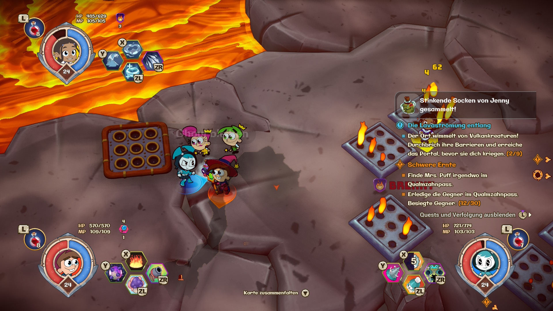 Habt Ihr es dann durch die 3 Abschnitte einer Welt geschafft, wartet ein Boss auf euch. Doch vor ihm liegt ein eigenes Level, welches eigentlich nicht als Level bezeichnet werden kann. Es ist immer ein langer, meist sogar sehr gradliniger Schlauch mit jeder Menge, wie könnte es auch anders sein, Loot und einem Dimensionstor am Ende, welches euch zum Boss führt. Diese Abschnitte hätte man sich auch sparen und dafür direkt den Boss einläuten können. Die Bosse könnten kaum unterschiedlicher zum restlichen Gameplay sein. Euch erwartet hier teilweise eine Bullethell an Projektilen und Feuerwänden die es in sich haben. Hier solltet Ihr stets eure Lebensleiste im Blick halten und von euren Spezialfähigkeiten Gebrauch machen. Jede eurer Figuren schaltet im Laufe des Spieles weitere Spezialangriffe frei. Dabei leveln alle Charakter gleichzeitig, egal für wen Ihr Euch entscheidet. Diese Spezialangriffe sind nicht nur witzig gemacht – wenn sich Cosmo und Wanda z. B. In eine riesige Kanone verwandeln oder es über dem Gegner plötzlich Pilze regnet – sondern auch vollkommen overpowerd. Das einzige, was euren Gegner daran hindert, sofort das Zeitliche zu segnen, ist die unglaubliche Geschwindigkeit, mit der sich einige Bosse fortbewegen. Hierbei kann euch eine helfende Hand guttun.