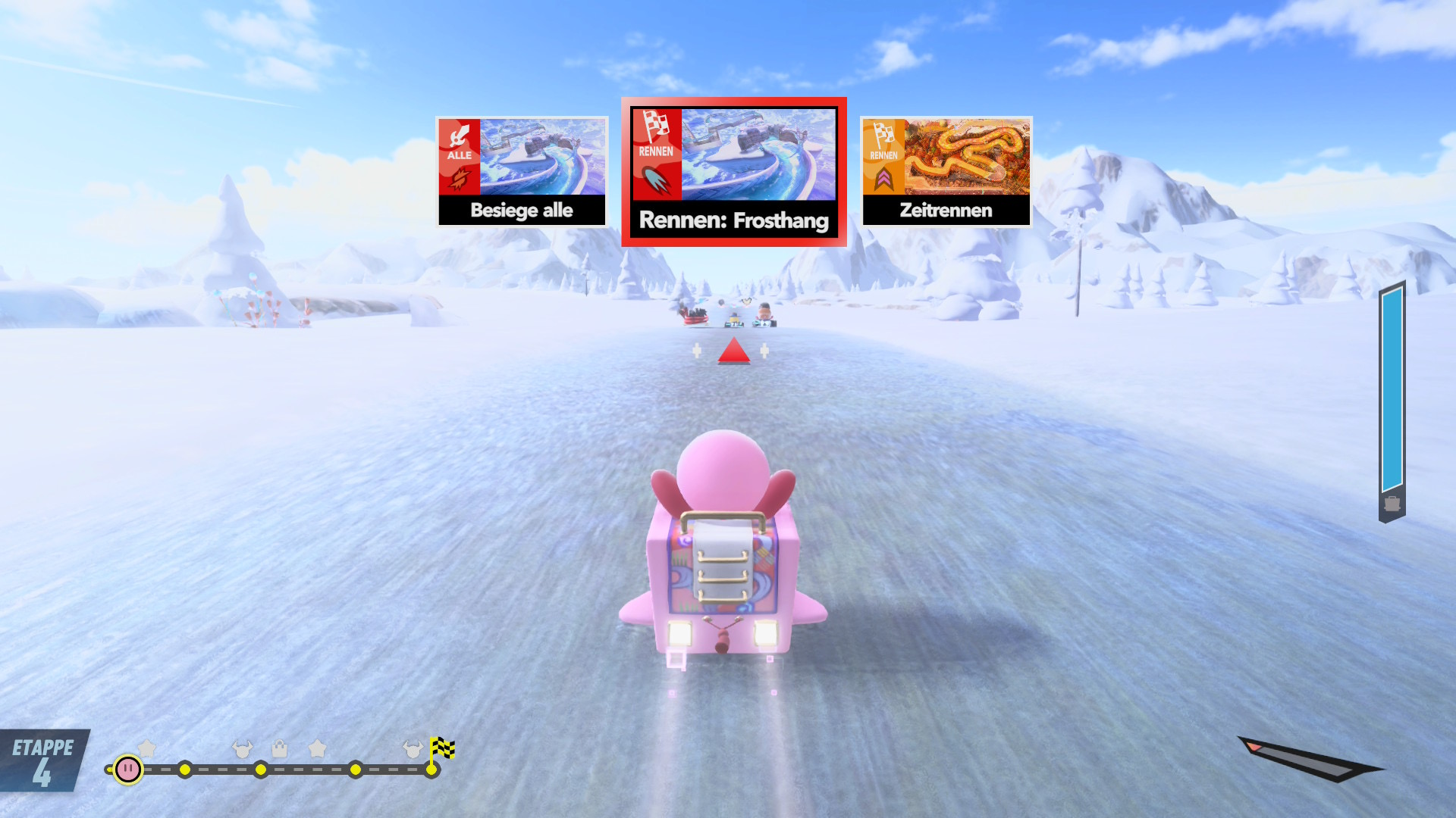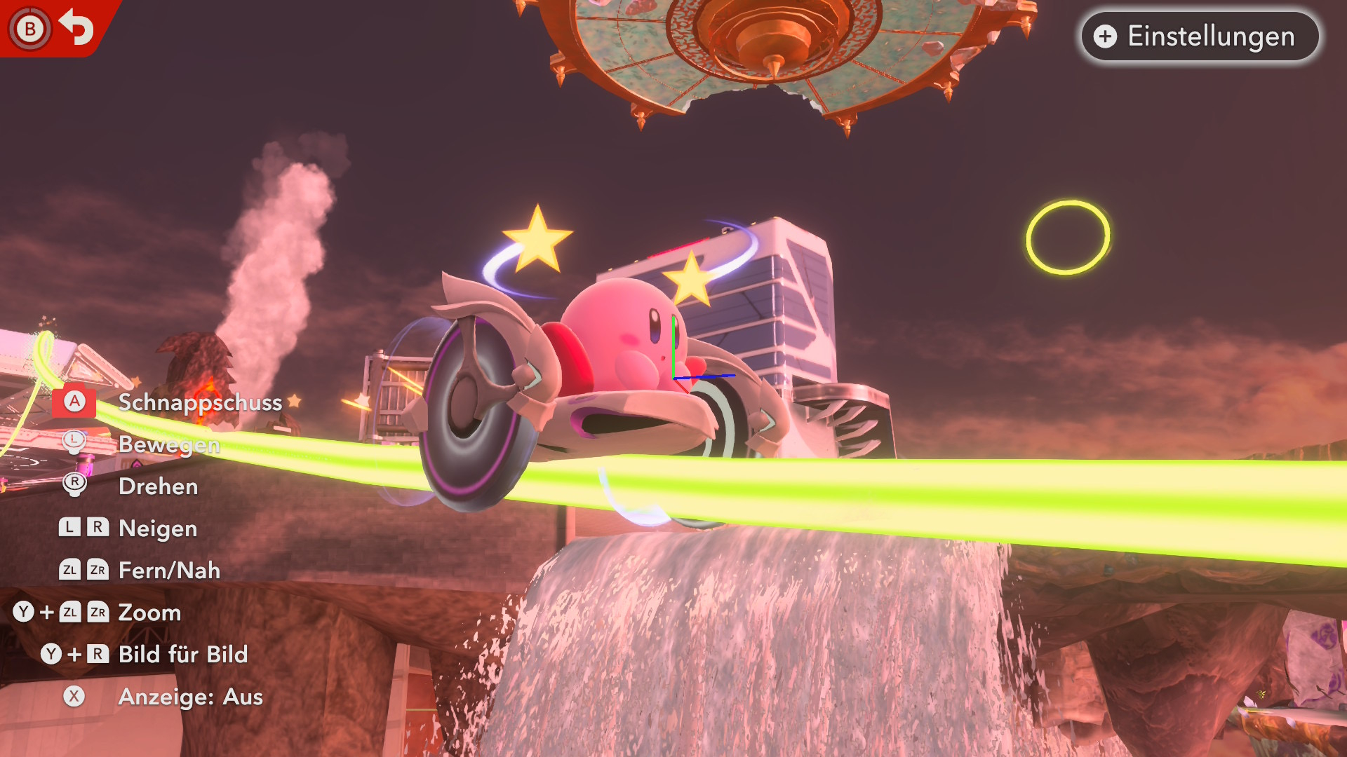 City Trial dreht das Tempo noch einmal anders auf. Fünf Minuten lang gurkt ihr durch Celestia, sammelt Stärkungen, wechselt Maschinen und werdet von Feld-Events überrascht, bevor das Spiel euch in eine zufällige Stadion-Herausforderung wirft, die eure gesammelten Werte prüft. Top Ride dagegen zwingt euch in die Vogelperspektive und in eine Panzer-Steuerung, die kurze Strecken zur Präzisionsarbeit macht. Genau hier greift die Freischaltstruktur besonders gut: Durch freischaltbare Elemente bringt uns Kirby Air Riders dazu, bestimmte Dinge auszuprobieren, um sie freischalten zu können. Belohnend ist das nicht nur wegen neuer Rider und Gefährte, sondern auch, weil ihr euren Maschinen-Look Schritt für Schritt selbst baut und so jede Runde einen Grund bekommt.
